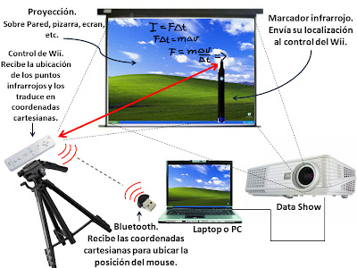 En la siguiente imagen nos muestra los diferentes componentes que necesitamos en el aula para utilizar una pizarra digital: